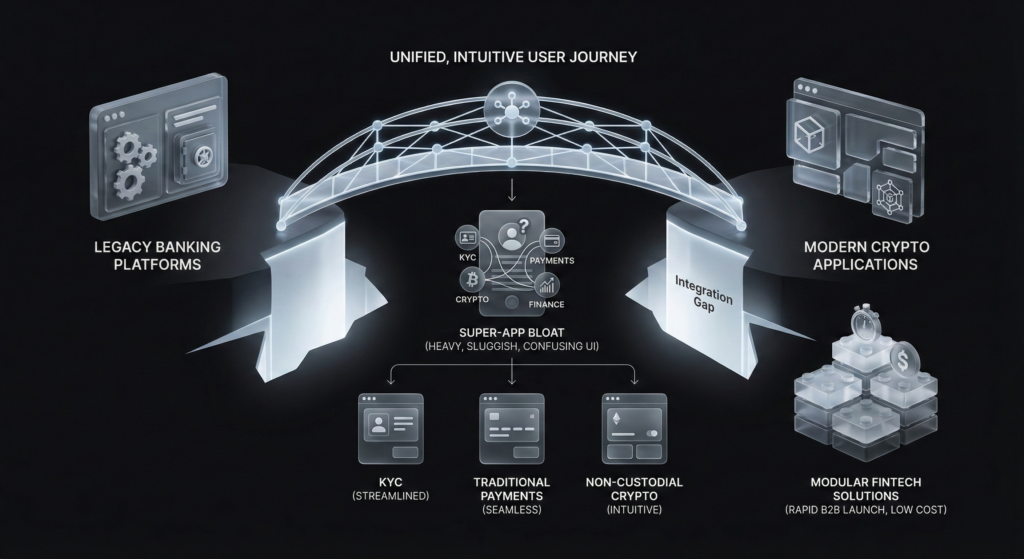 The modern financial landscape is heavily fragmented, creating a significant “Integration Gap.” Users are frequently forced to navigate disjointed experiences between legacy banking platforms and modern crypto applications. For businesses, attempting to combine these services historically resulted in “Super-App Bloat”—heavy, sluggish, and confusing user interfaces. A solution was needed to provide a unified, intuitive user journey across diverse financial services (such as KYC, traditional payments, and non-custodial crypto management) without compromising usability or increasing cognitive load. Additionally, B2B partners faced excessively long launch cycles and high costs when attempting to design custom fintech solutions from scratch.