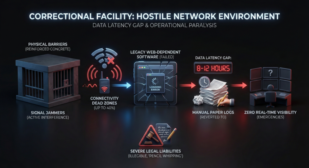 Correctional facilities present “hostile network environments.” Physical barriers like reinforced concrete and the active use of signal jammers create massive connectivity dead zones, covering up to 40% of a facility. Relying on legacy, web-dependent software in these environments resulted in operational paralysis. When software failed in dead zones, officers reverted to manual paper logs, creating an 8-to-12-hour “Data Latency Gap.” This delay left command staff with zero real-time visibility during emergencies. Furthermore, paper logs introduced severe legal liabilities due to illegible handwriting and the practice of “pencil whipping” (falsifying observation checks).